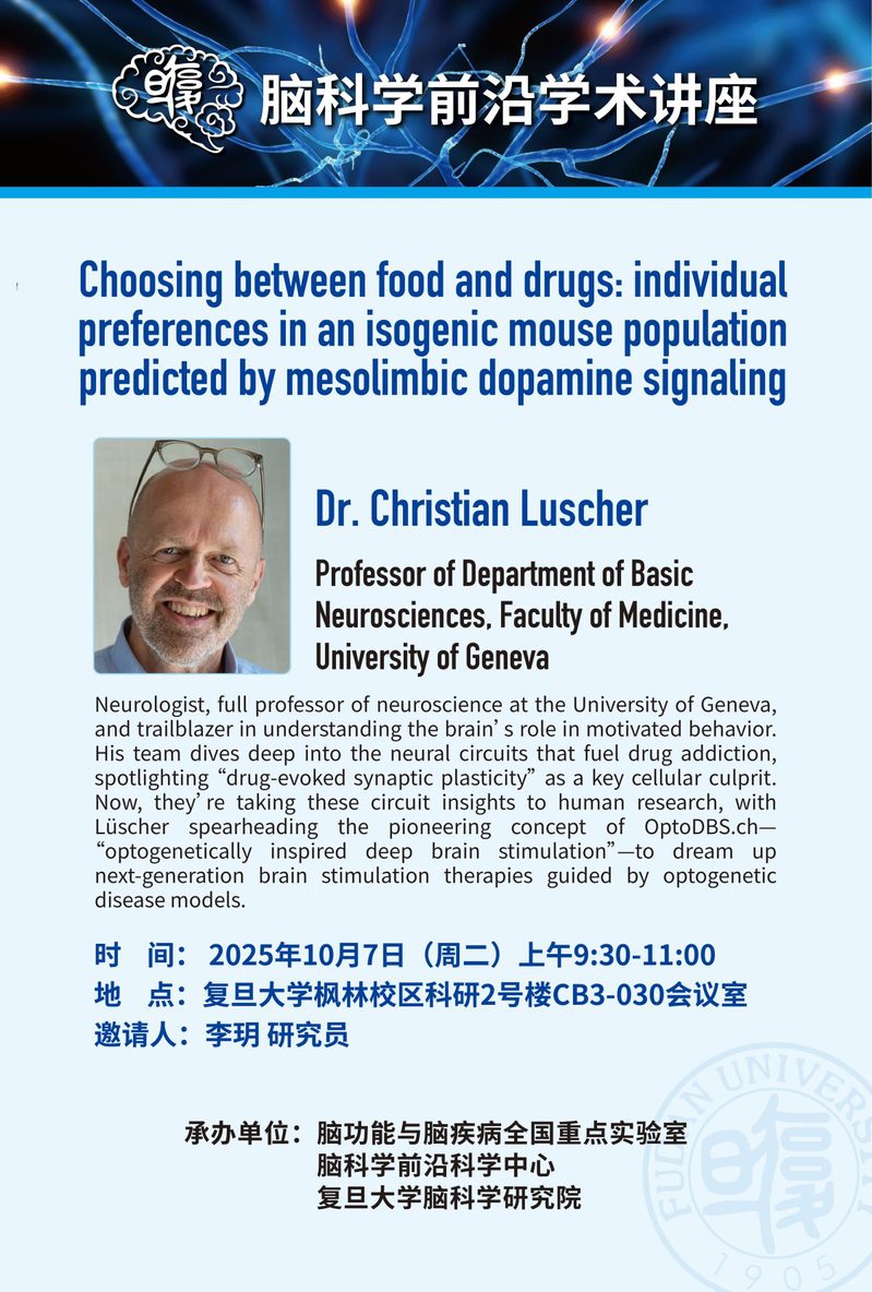 [讲座信息]Choosing between food and drugs: individual preferences in an isogenic mouse population predicted by mesolimbic dopamine signaling
