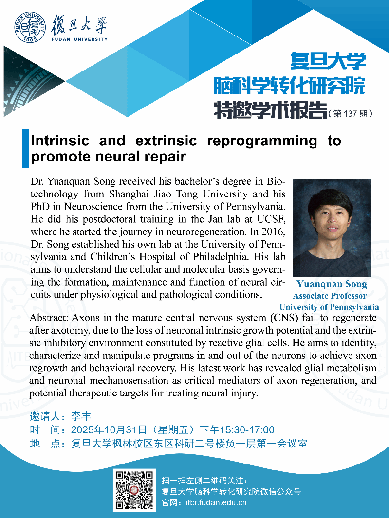 [讲座信息]Intrinsic and extrinsic reprogramming to promote neural repair