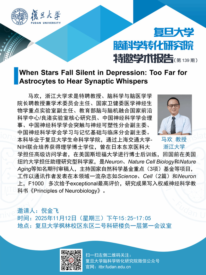 [讲座信息]When Stars Fall Silent in Depression: Too Far for Astrocytes to Hear Synaptic Whispers