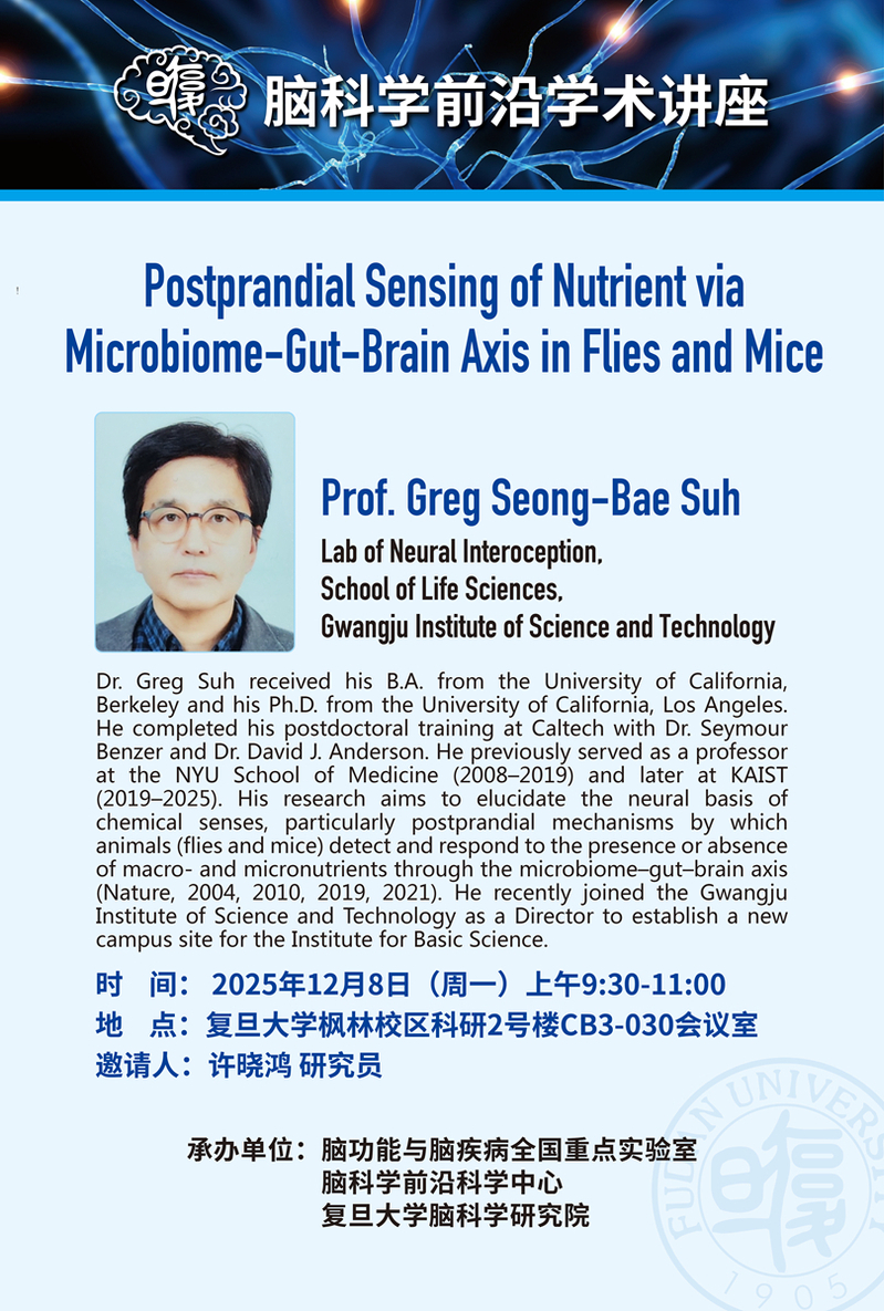 [讲座信息]Postprandial Sensing of Nutrient via Microbiome-Gut-Brain Axis in Flies and Mice