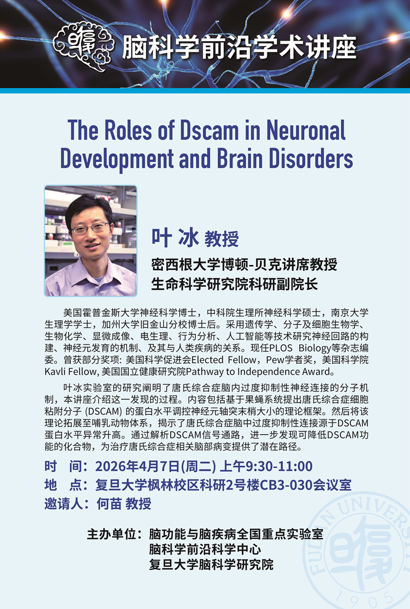 [讲座信息]The Roles of Dscam in Neuronal Development and Brain Disorders