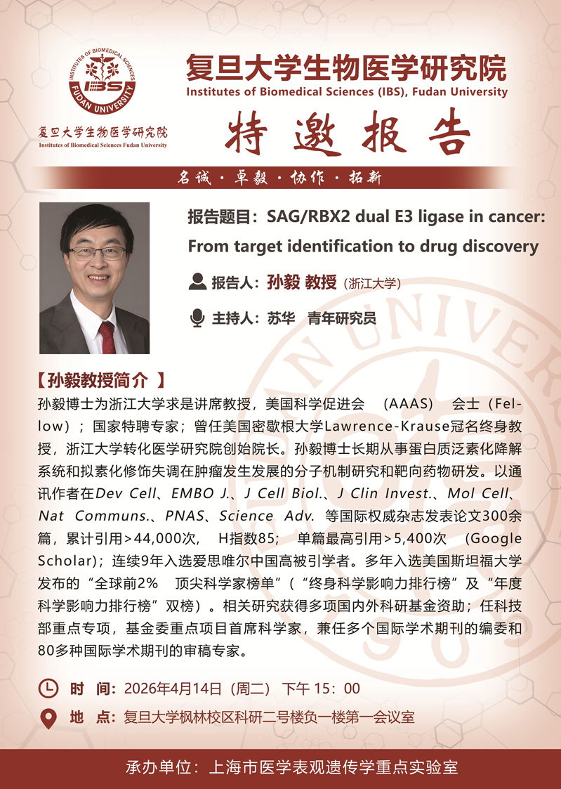 [讲座信息]SAG/RBX2 dual E3 ligase in cancer: From target identification to drug discovery
