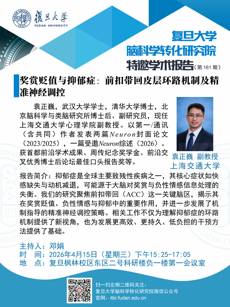 [讲座信息]奖赏贬值与抑郁症:前扣带回皮层环路机制及精准神经调控
